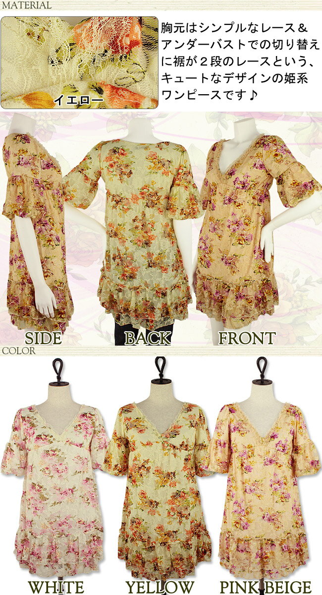 特徴 総レース フリル 花柄レース ミディアム丈 体型カバー 色展開 ホワイト(白)・イエロー(黄色)・ピンクベージュの3色展開 注意 画面上と実物では多少色具合が異なって見える場合もございます。